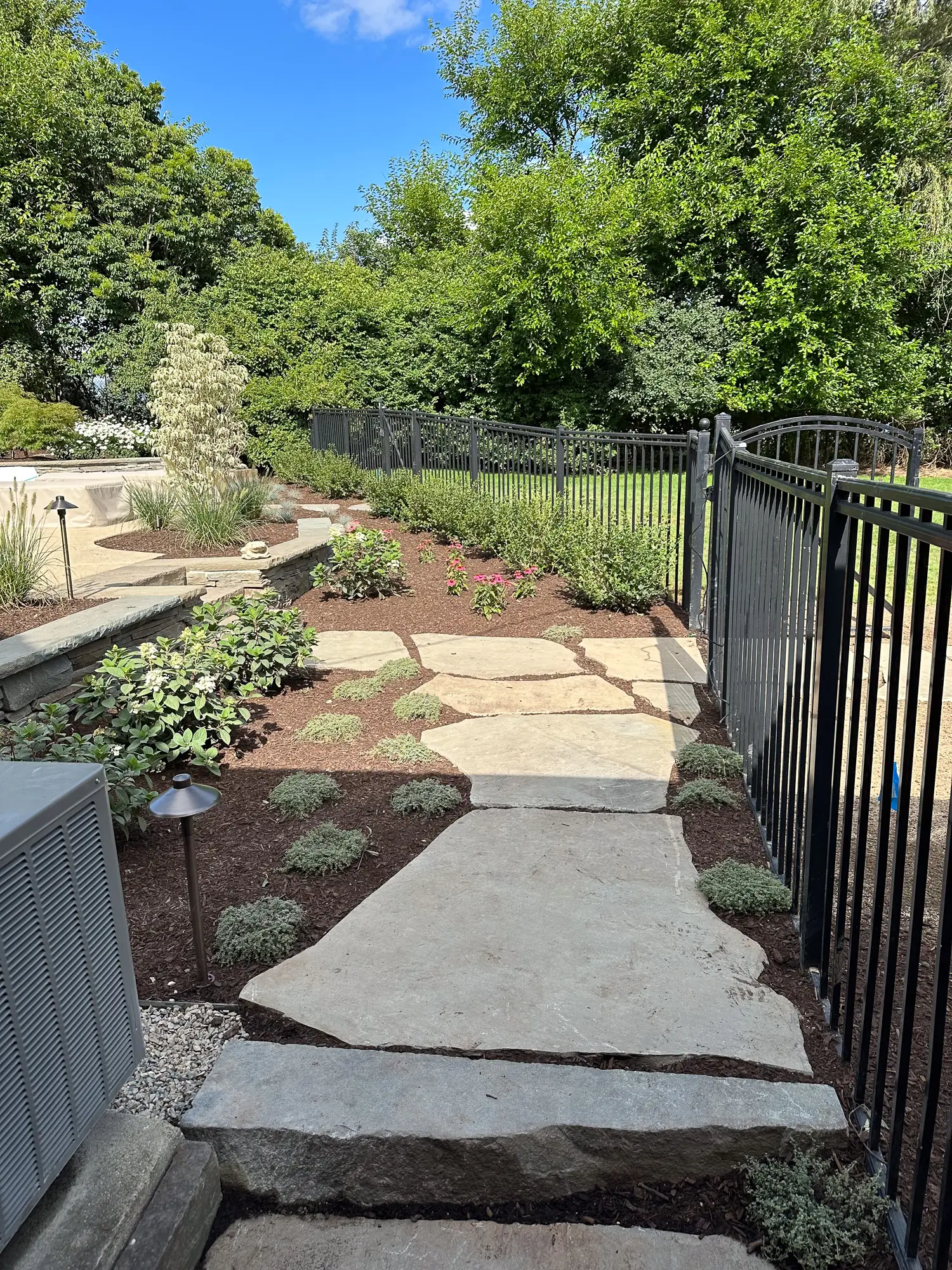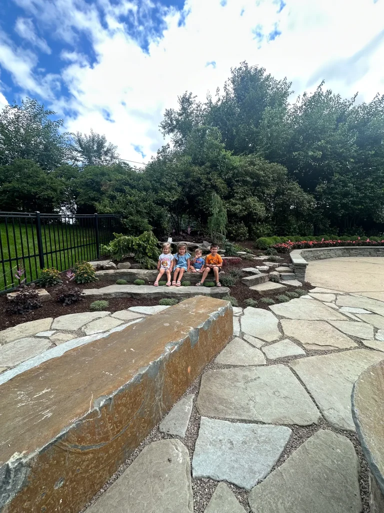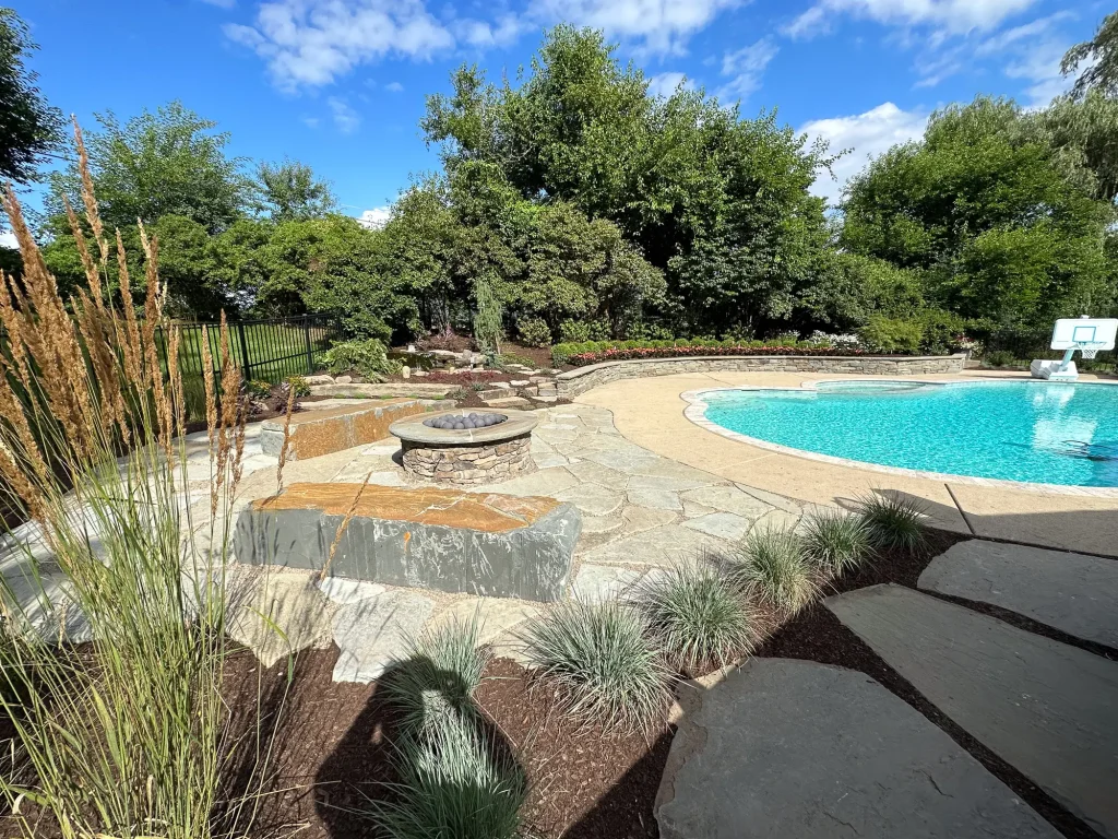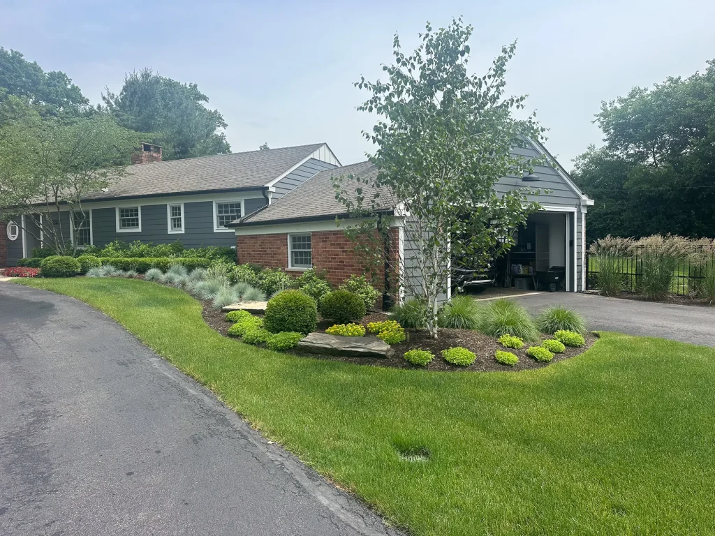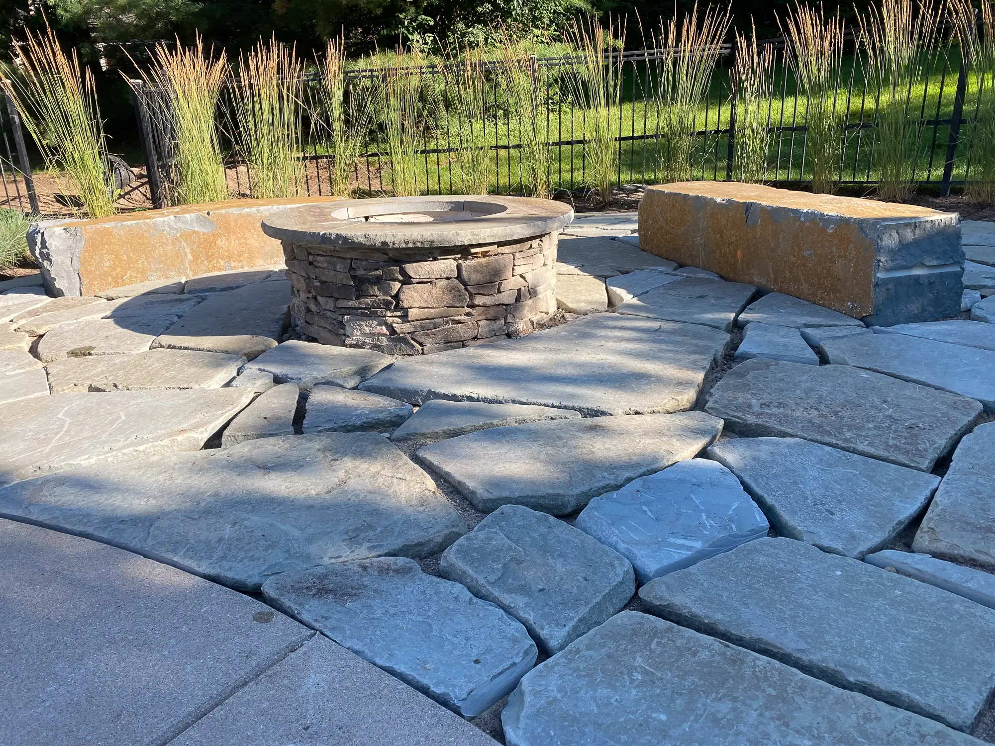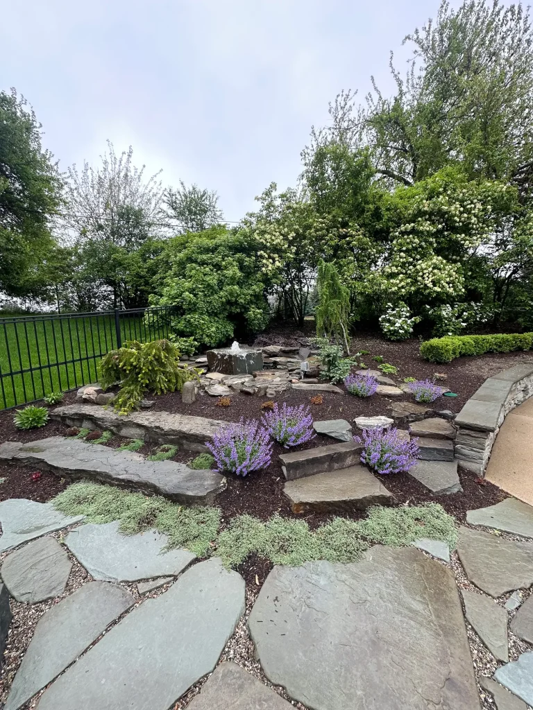 Complete landscape renovation. Demolition of existing retaining walls, Remove all vegetation from landscape beds, broken bluestone dry stack wall with bluestone caps, water feature install, gas fire pit with bluestone veneer and bluestone caps, large natural bluestone benches, all new trees, shrubs, perennials, 12-14’ Norway spruce planting for privacy screening, bluestone address marker engraved with address, all new landscape lighting and irrigation.