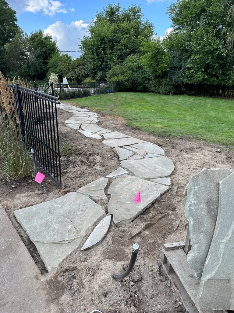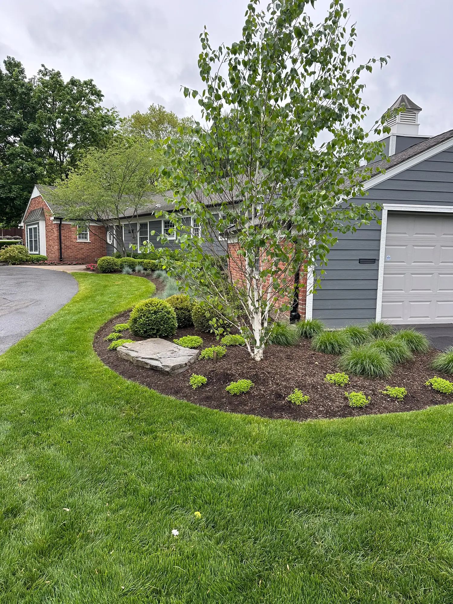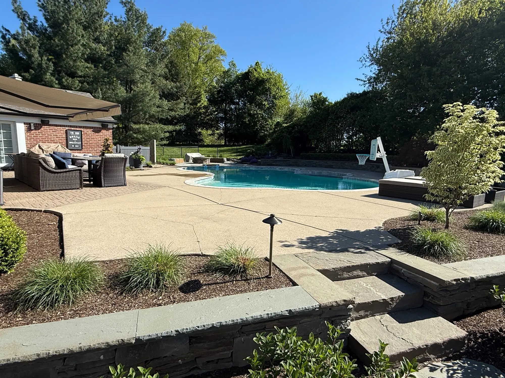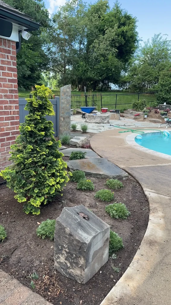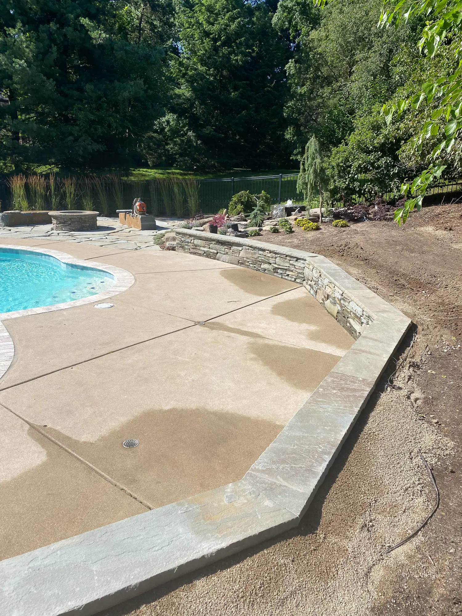 Complete landscape renovation. Demolition of existing retaining walls, Remove all vegetation from landscape beds, broken bluestone dry stack wall with bluestone caps, water feature install, gas fire pit with bluestone veneer and bluestone caps, large natural bluestone benches, all new trees, shrubs, perennials, 12-14’ Norway spruce planting for privacy screening, bluestone address marker engraved with address, all new landscape lighting and irrigation.