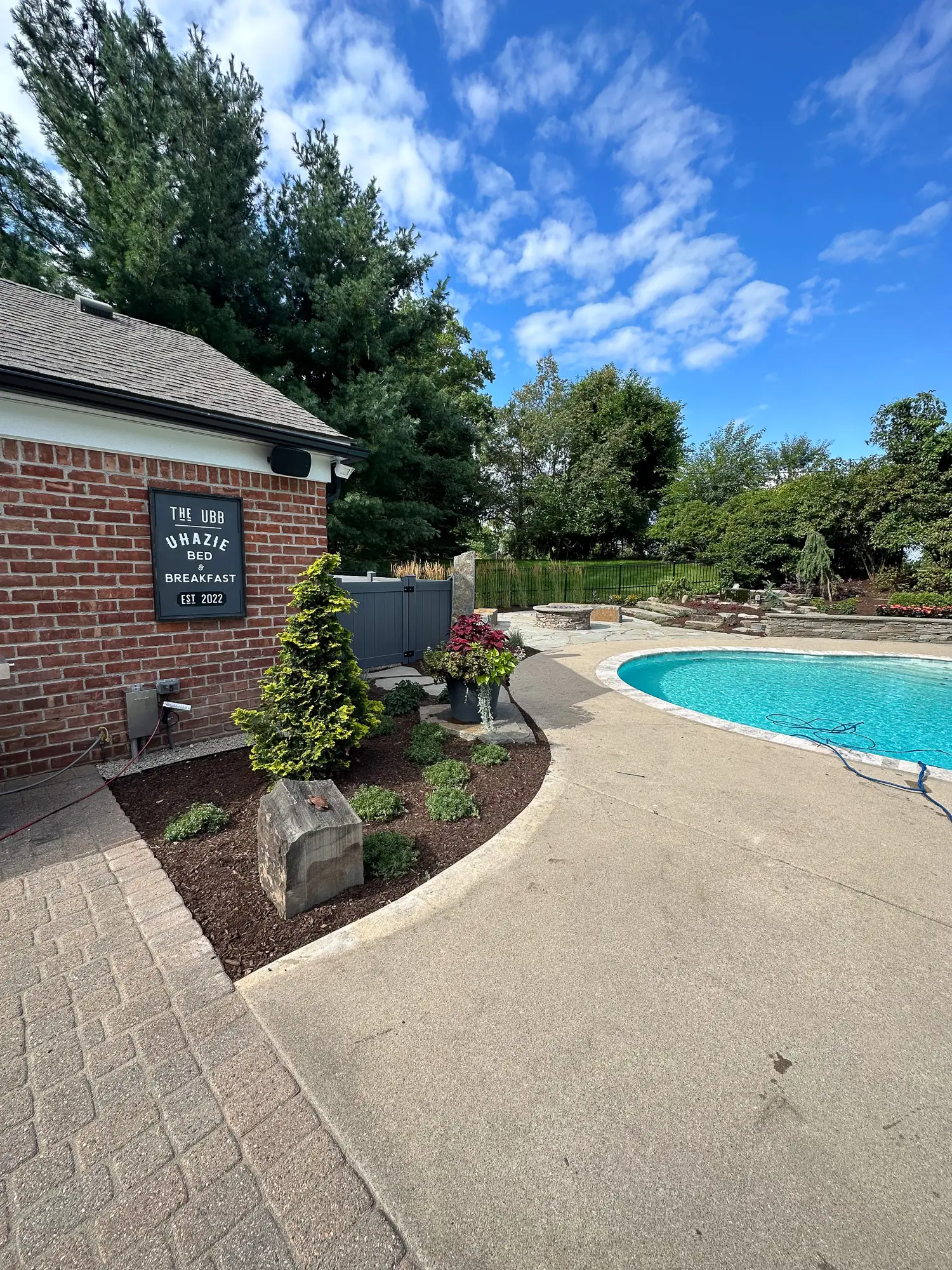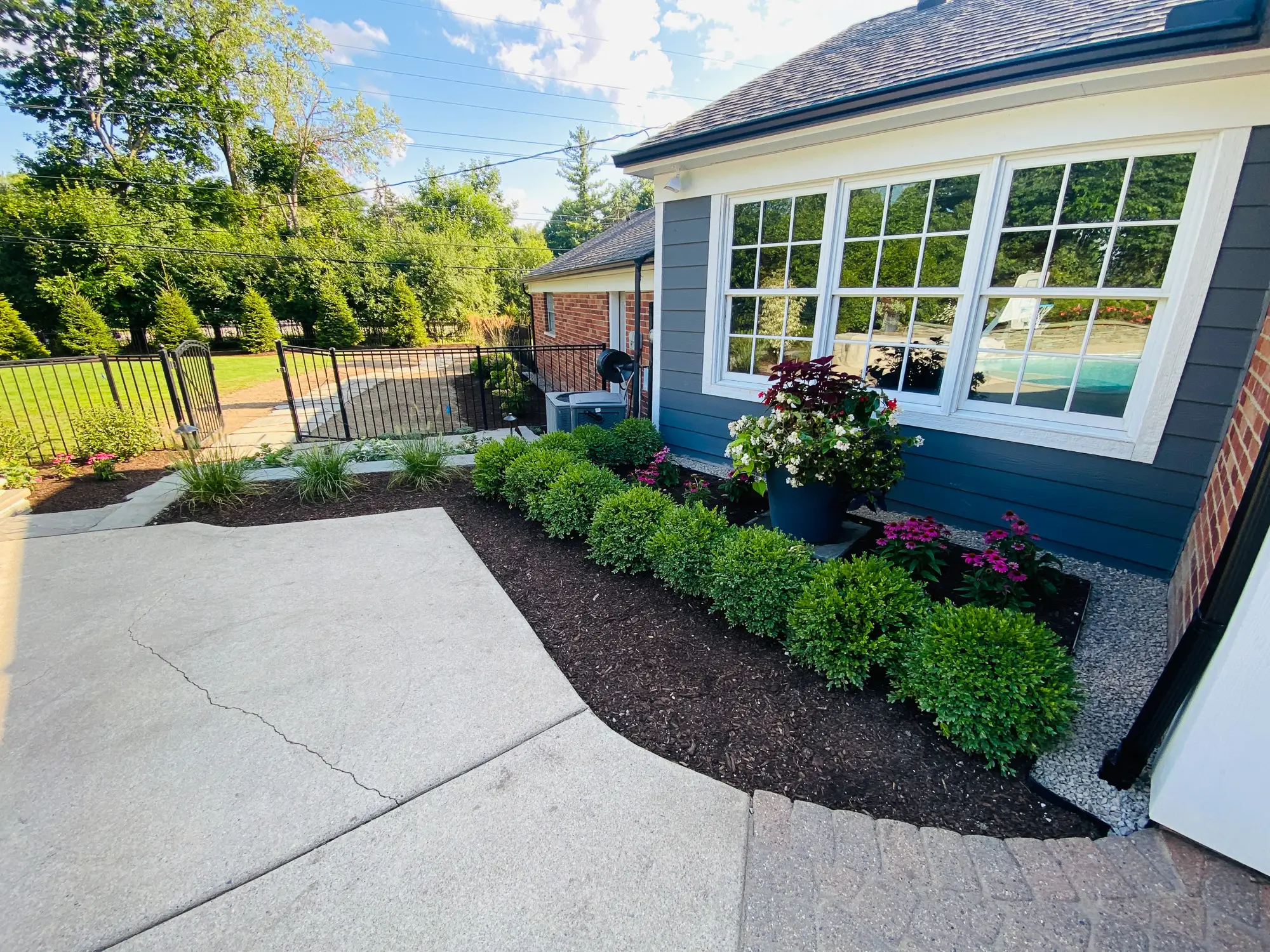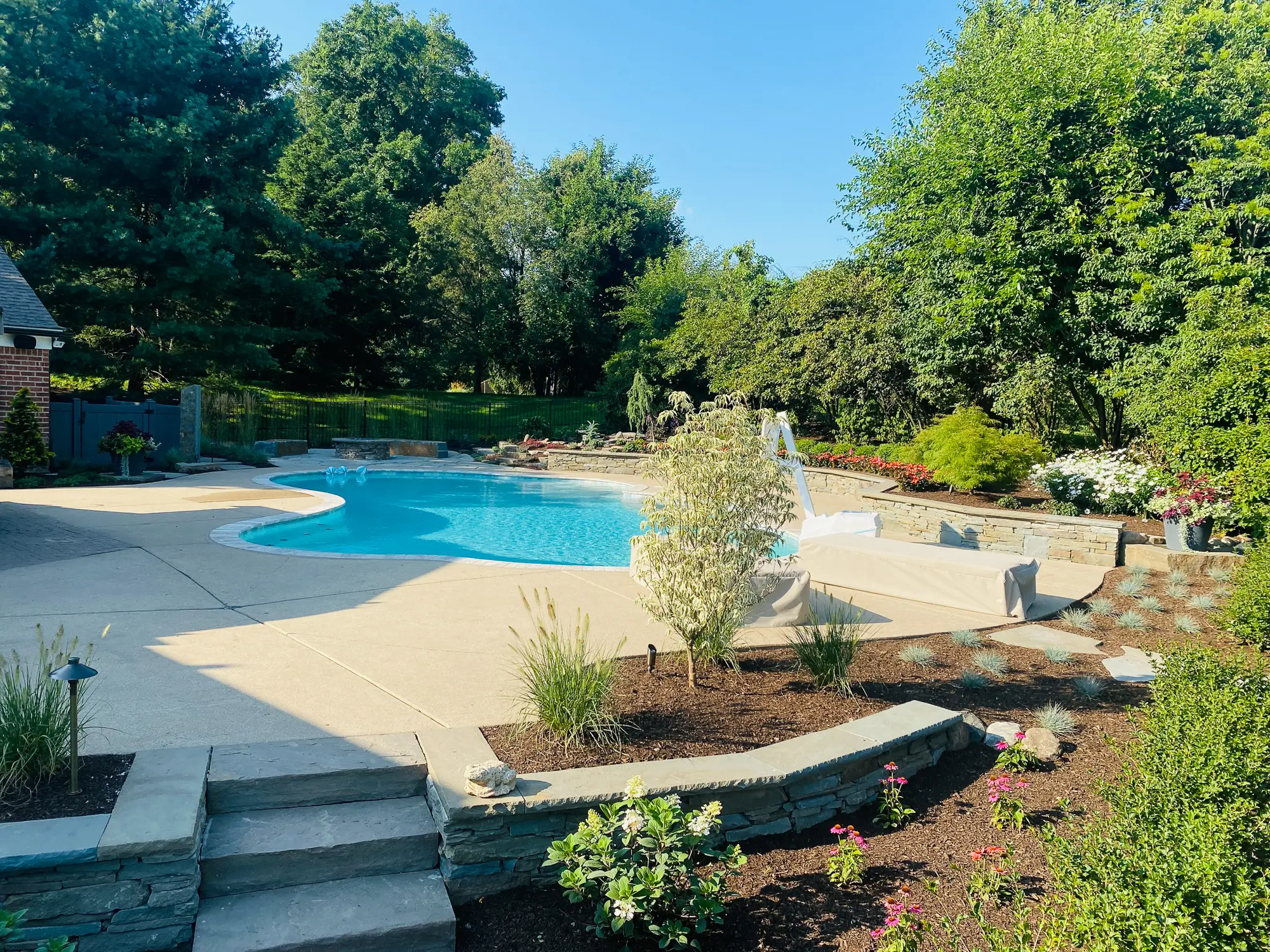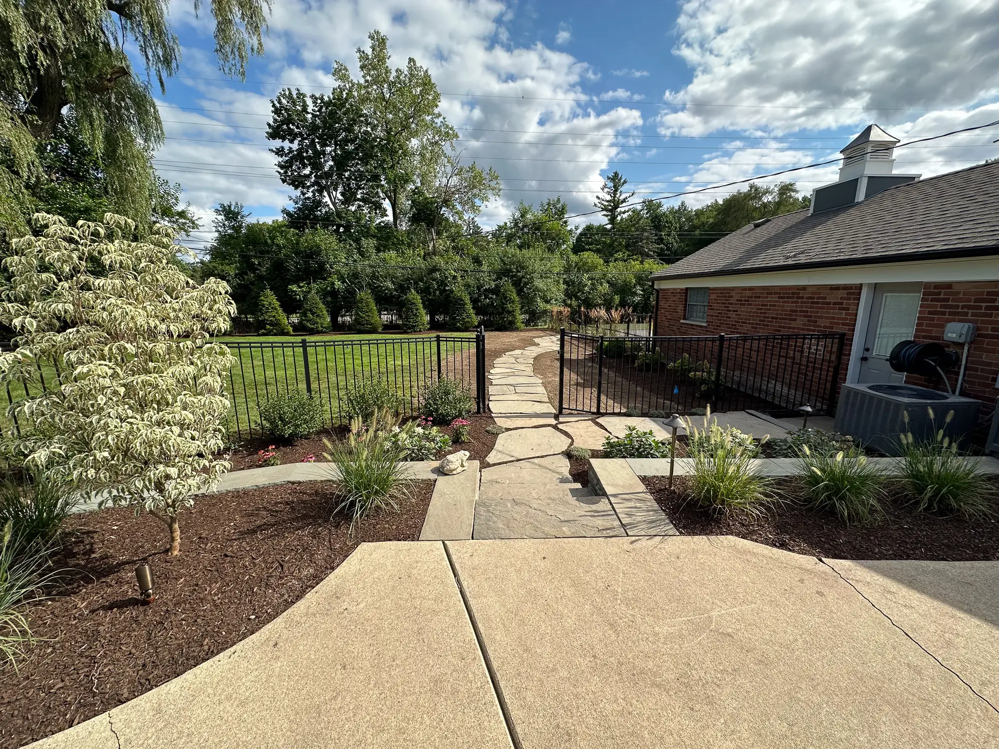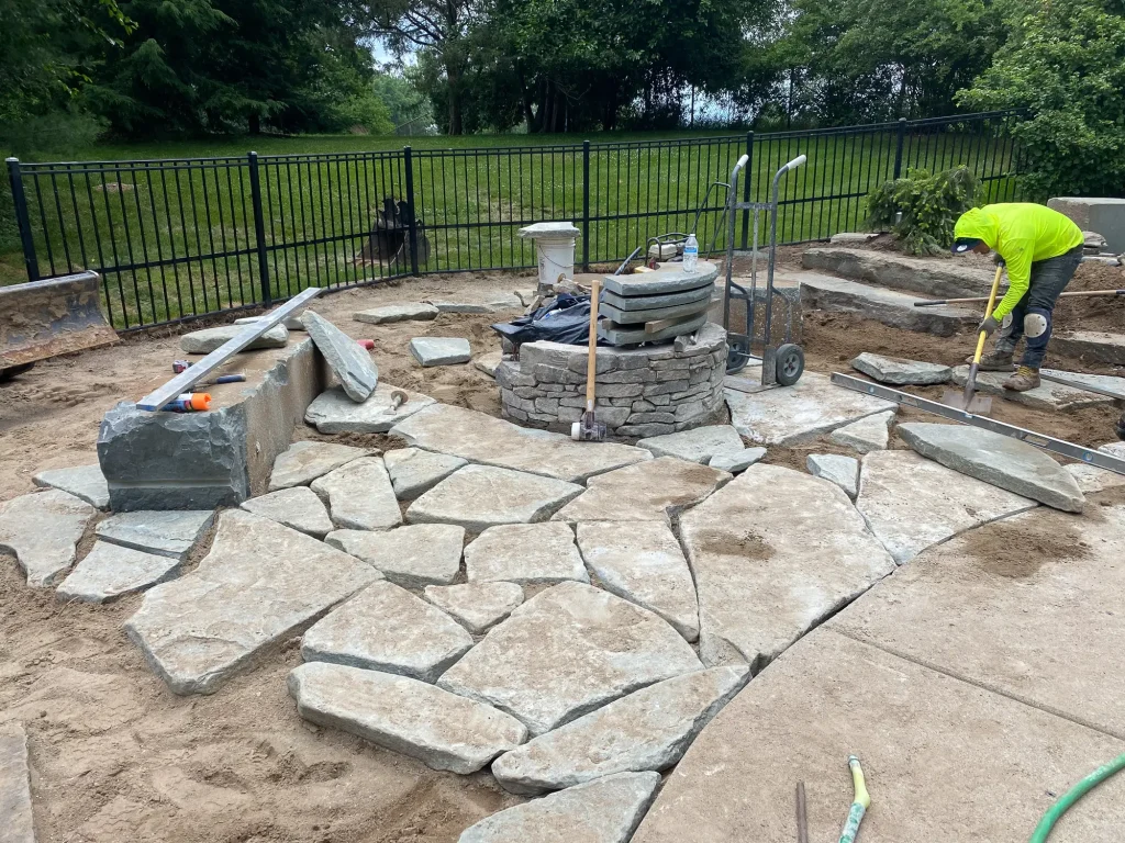 Complete landscape renovation. Demolition of existing retaining walls, Remove all vegetation from landscape beds, broken bluestone dry stack wall with bluestone caps, water feature install, gas fire pit with bluestone veneer and bluestone caps, large natural bluestone benches, all new trees, shrubs, perennials, 12-14’ Norway spruce planting for privacy screening, bluestone address marker engraved with address, all new landscape lighting and irrigation.