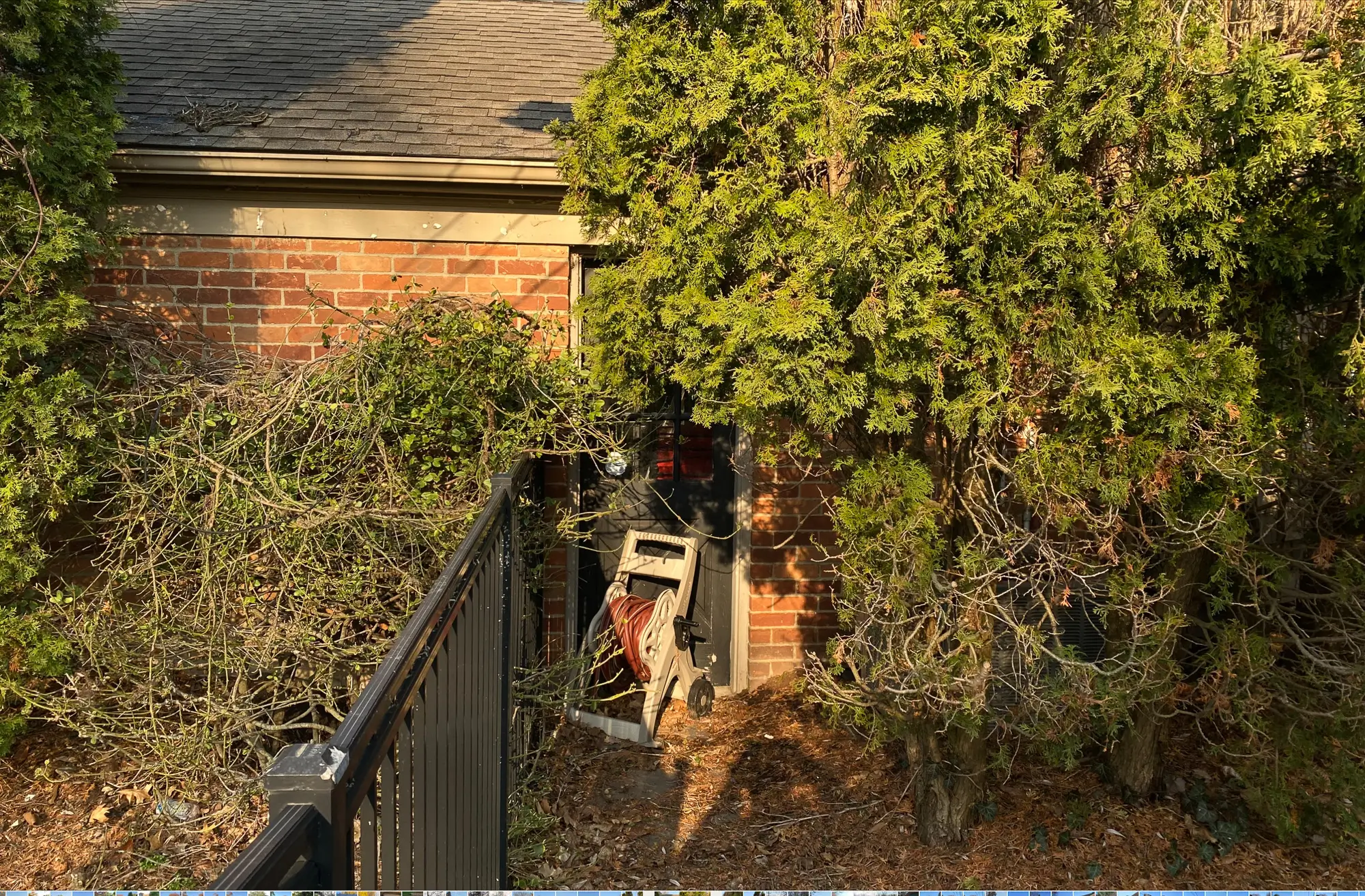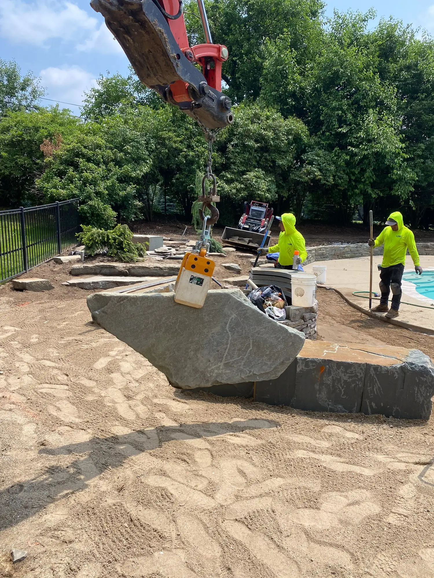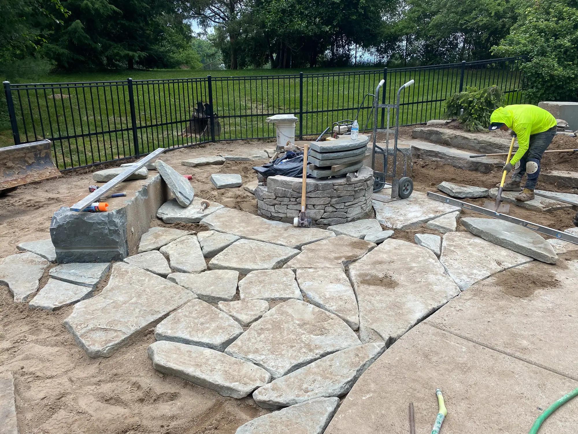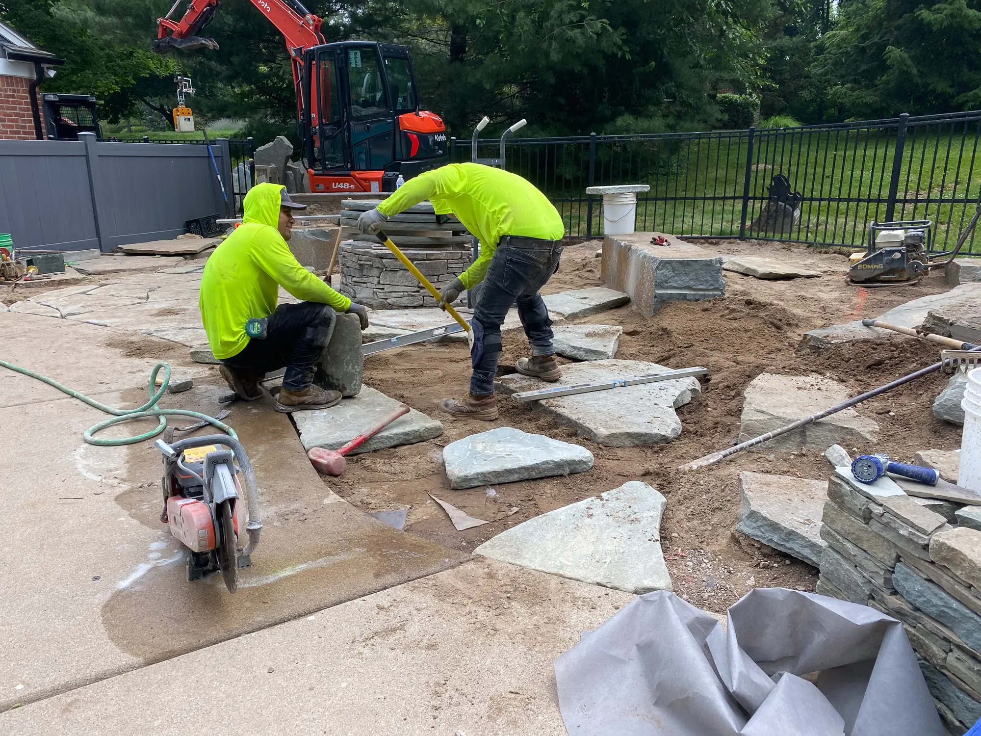 Complete landscape renovation. Demolition of existing retaining walls, Remove all vegetation from landscape beds, broken bluestone dry stack wall with bluestone caps, water feature install, gas fire pit with bluestone veneer and bluestone caps, large natural bluestone benches, all new trees, shrubs, perennials, 12-14’ Norway spruce planting for privacy screening, bluestone address marker engraved with address, all new landscape lighting and irrigation.
